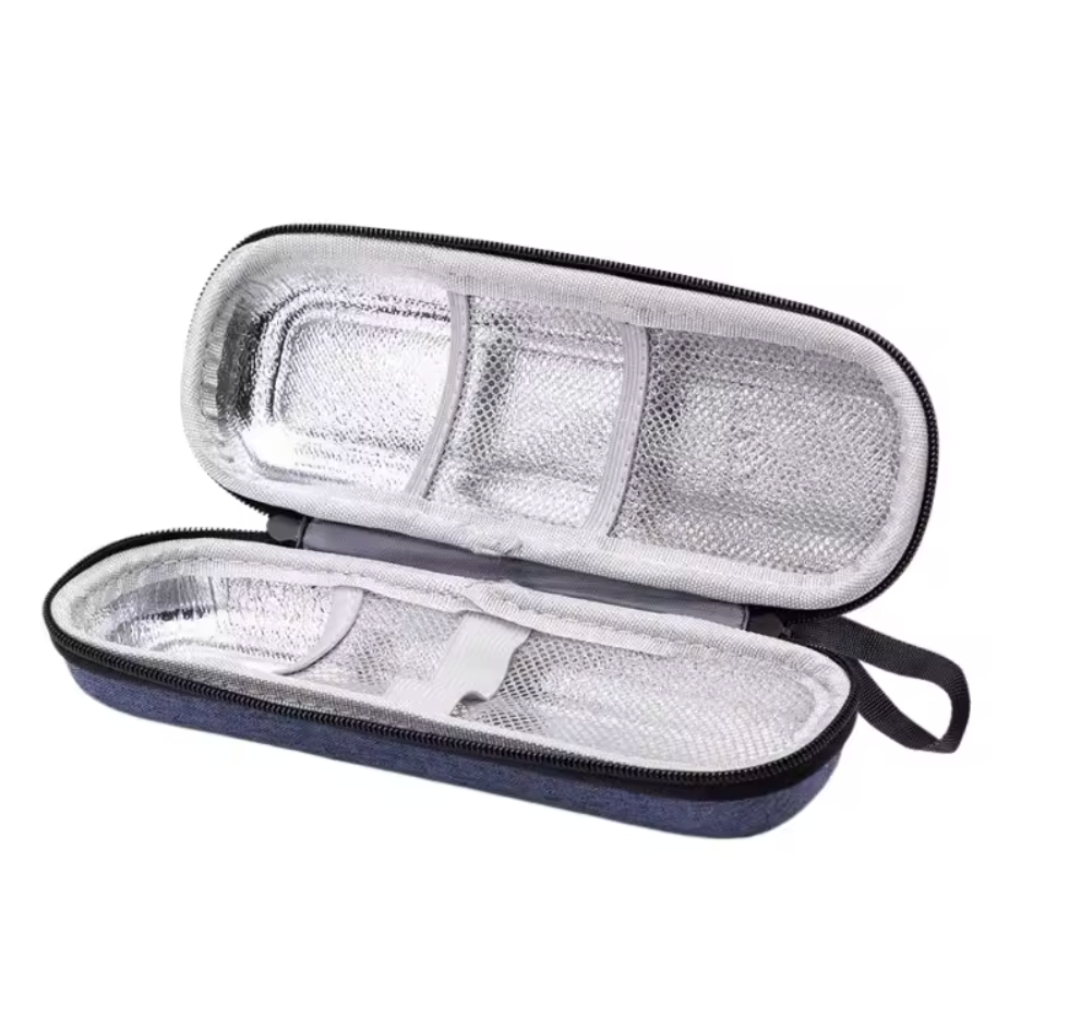 This compact insulated pen case is designed to safely store and transport injection pens, cartridges, or other small research supplies. The interior features thermal insulation with mesh pockets and elastic straps to keep everything secure and organized.